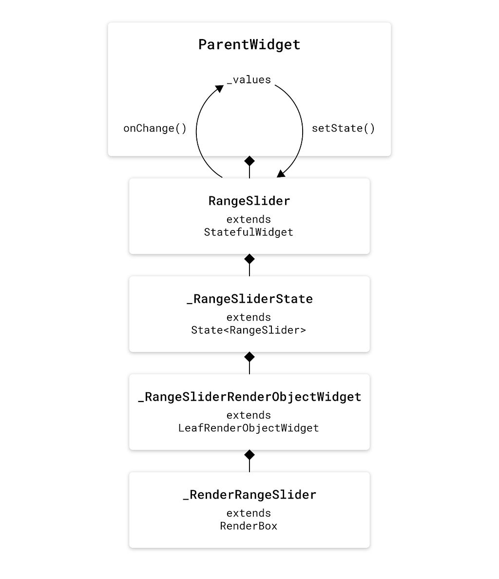 RangeSlider 的 State 物件會構建 LeafRenderObjectWidget。所有內容都繪製在它的內部 RenderBox 中,它也處理觸控輸入。